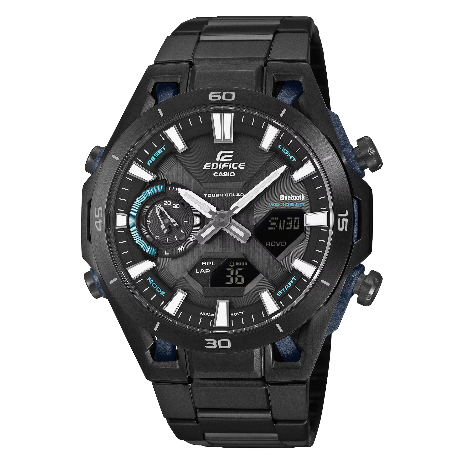 Race car engineering and design, welcome to the world of wristwatches! The EDIFICE ECB-2300 SOSPENSIONE, advanced functionality and sophistication inspired by true motorsports form. This timepiece is all about creativity, capturing the sophisticated mechanical beauty involved in motorsports. Its arm-shaped lugs evoke the double wishbone suspension of Formula racing cars, while the three-dimensional protrusions recall the push rods of a race car. Add to this the depth of the dimensional dial, and you have a timepiece imbued with a dynamic presence all its own. The case combines carbon fiber-reinforced resin and stainless steel for lightness and high rigidity like a racing machine. At 2 mm less in diameter than the previous ECB-2000 SOSPENSIONE, this compact design delivers everyday easy comfort and a more stylish fit. More than just a stylish presence, the EDIFICE ECB-2300 SOSPENSIONE delivers full-on functionality, as well. Smartphone pairing via Bluetooth® delivers automatic time correction and makes it easy to configure world time and other functions from the app. With Tough Solar for stable operation of functions, scratch-resistant sapphire crystal, practical 100-meter water resistance and more, you’ll be at peak performance. Experience beauty and technological sophistication taken straight from the world of precision racing machines, all for yourself, right on your wrist. The EDIFICE ECB-2300 SOSPENSIONE, the ideal timepiece for racing fans who want to express their passion for motorsports every day.